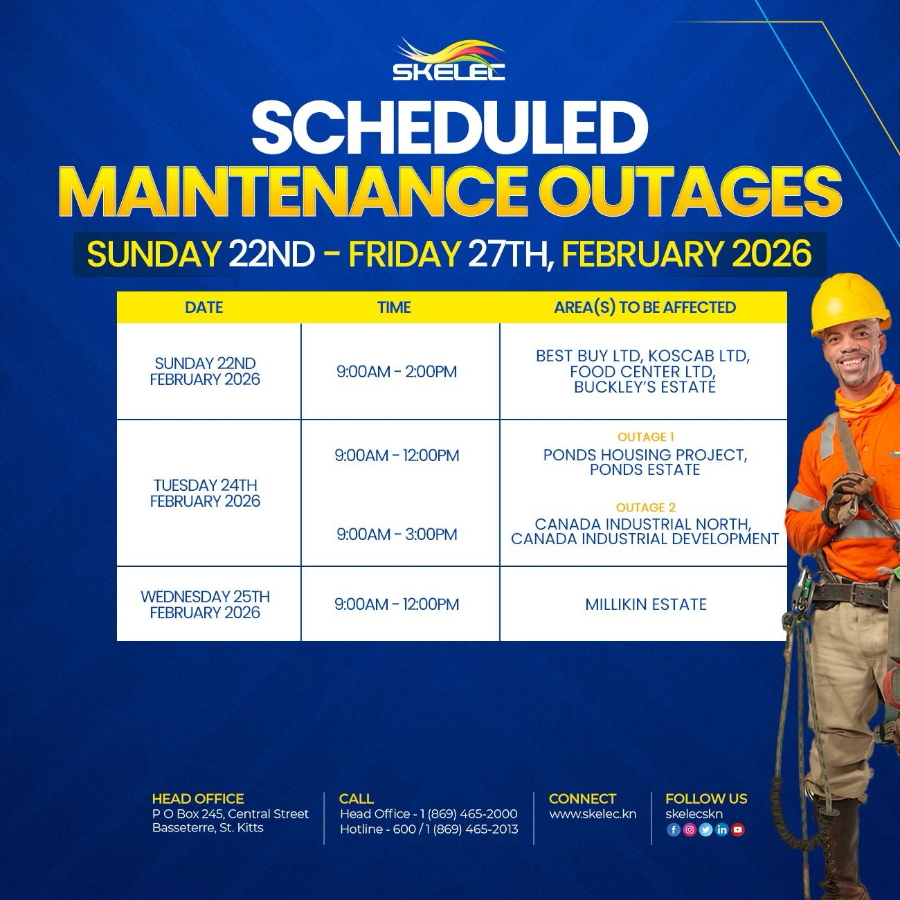 The St. Kitts Electricity Company Ltd. is advising the public of scheduled maintenance outages for the week of Sunday 22nd February- Friday 27th February 2026. The scheduled maintenance outages are