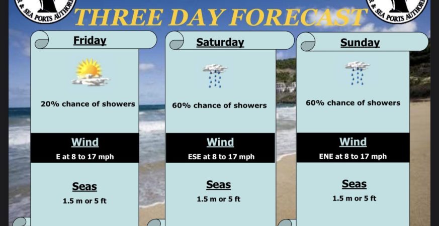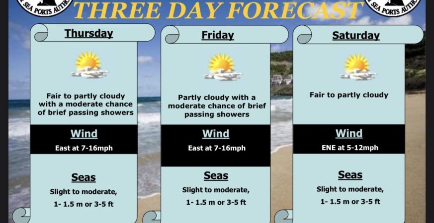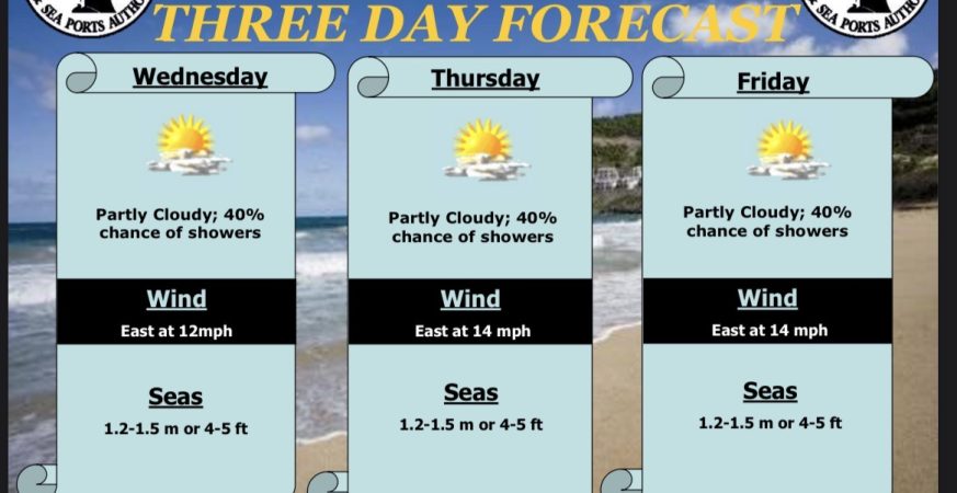 Robert L. Bradshaw International Airport St. Kitts Meteorological Services St. Christopher Air & Sea Port Authorities P.O. Box 963 Basseterre St. Kitts Tel: 869 465 2749 Tele- fax: 869 465 9122 Weather Bulletin Issued at: 4pm Friday 27th March 2026 Present Weather: Partly Cloudy Skies Winds: A moderate breeze of 14mph from the East Temperature: […]