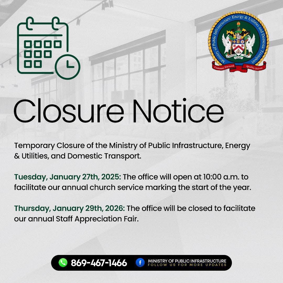 Closure Notice – Ministry of Public Infrastructure: Energies, Utilities and Domestic Transport