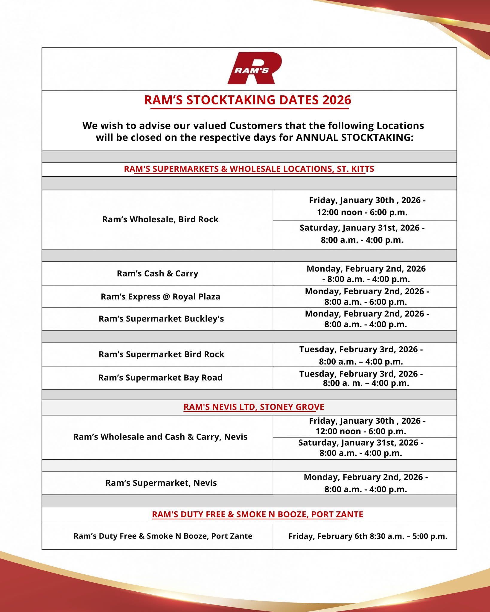 • RAM’S Stocking Dates 2026