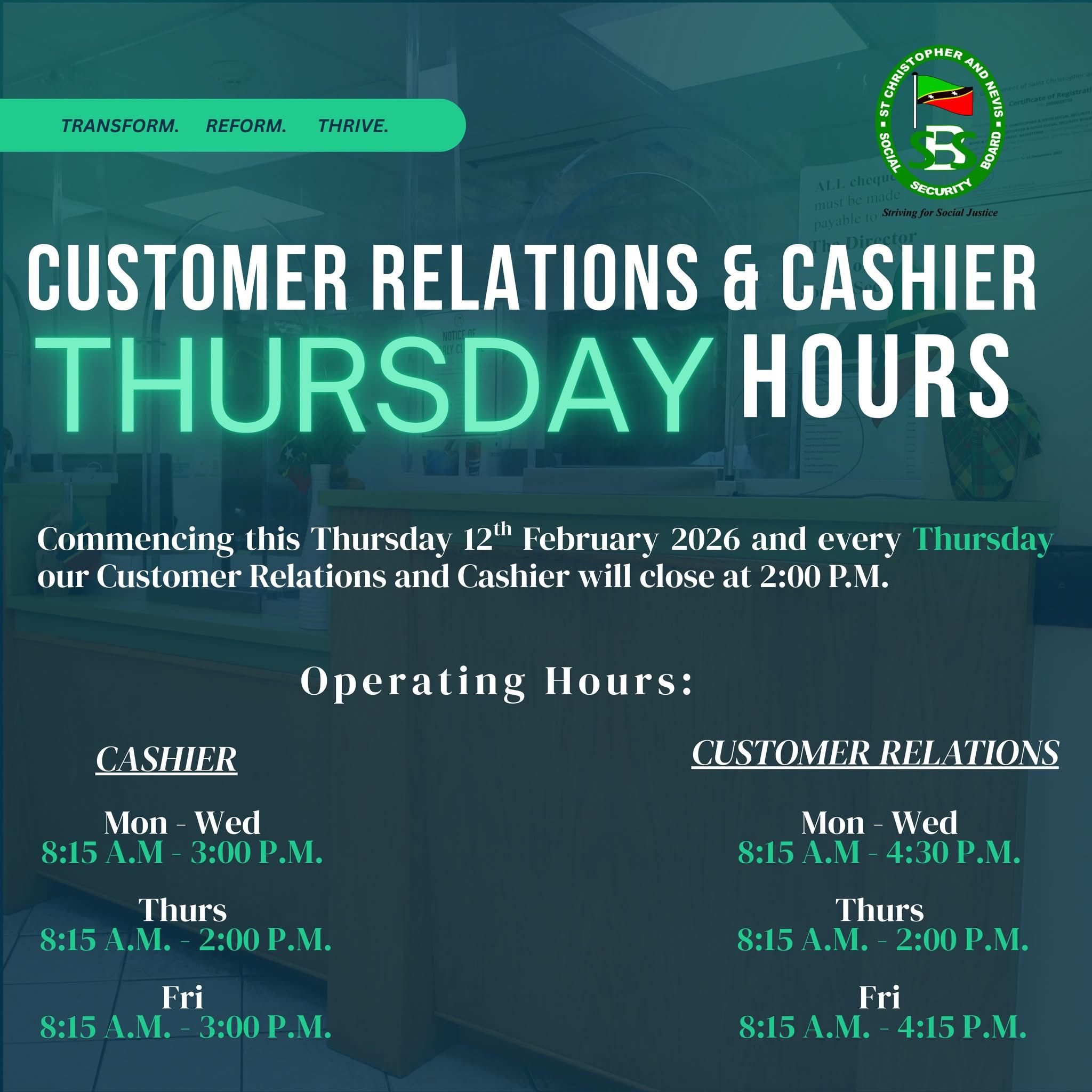Please be advised that effective Thursday 12th February 2026, and every Thursday thereafter, our Cashiers and Customer Relations counters will close at 2:00PM.